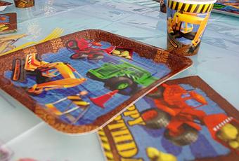 J'ai trouvé mon bonheur avec la boîte à fête chantier. Elle contient 8 assiettes carrées avec des engins, 8 gobelets, 16 serviettes en papier et des cuillères et fourchettes.