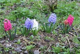 J’avais planté des jacinthes il y a plus de 20 ans. C’était la forme sélectionnée et traitée pour donner de grosses hampes florales aux nombreuses fleurs serrées que l’on trouve en vente partout. Je n‘ai pas de photos de leur première floraison parce qu’à l’époque je faisais peu de photos, il n’y avait pas encore le numérique et cela coûtait trop cher. A la place je peux vous montrer celles que j’ai plantées à Romilly en 2010 :