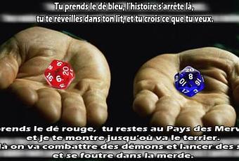 Tu prends le dé rouge, tu restes au Pays des merveilles et je te montre, jusqu'où va le terrier. Et là on va combattre des démons et lancer des sorts et se foutre dans la merde.