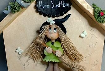 Support en bois en forme de maison avec comme décor de la mousse d'Islande et p'tit papillon