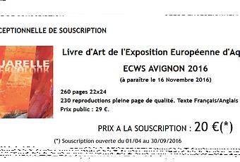 La Société française d'aquarelle va éditer un "Livre d’Art" à l’occasion de l’Exposition Européenne d’Avignon organisée dans le cadre de l' ECWS 2016 France. Il est en proposé en souscription jusqu'au 30 septembre 2016 au prix de 20 €uros au lieu de 29 €uros. L'ouvrage de 260 pages - format 22 x 24 cm sera disponible le 16 novembre 2016.