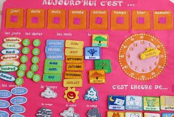 - Sur la partie de droite, on voit une horloge. C’est grâce à elle que l’enfant peut apprendre à lire l’heure. En dessous de cette horloge figure la mention « C’est l’heure de … » À cet endroit, l’enfant appose un badge qui représente le moment de la journée en fonction de l’heure qu’il a mise sur l’horloge. Il a alors le choix entre: dormir, se laver, aller à l’école, prendre le goûter…