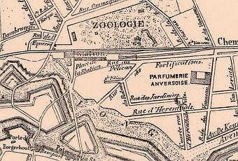 Extrait plan de la ville d'Anvers édité en 1865 et réalisé par J. Van de Kerckhove avant l'ouverture du chemin de fer de Rotterdam (1854) et avant la modification des fortifications, et après l'ouverture du chemin de fer de Bruxelles à Anvers (1836) et l'ouverture du ZOO (1844). Source.