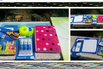 Des crayons, des feutres, un cahier, un agenda ( que je garde pour moi), de la colle, une ardoise, feutres pour l'ardoise, du scotch.