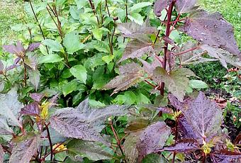 26/08/2014 : les hibiscus (celui de droite a créé une belle tige en boutons) et en arrière plan un dahlia en fleur