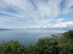 O. C, II, VO, 178 : « Vers le point du jour, nous aperçûmes, du haut des montagnes, une grande nappe d’eau, vaste et coupant au loin l’horizon comme une mer : c’était le lac Léman. […] De là, en deux heures par des campagnes encore vertes, par un pays charmant, au travers des jardins et des joyeuses villas, j’arrivais dans la patrie de Jean-Jacques Rousseau […]