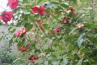 Ces deux camellias présentent l’avantage de perdre leurs fleurs avant qu’elles ne fanent, laissant l’arbuste toujours impeccable :