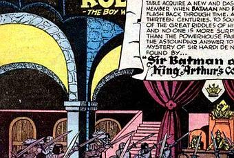 "Kane Bob, Batman, 36, aout-sept. 1946. Batman, le « chevalier noir » est transposé à la cour du roi Arthur. Les super-héros de DC Comics montrent les nouveaux chevaliers américains, qui n’ont rien à envier aux chevaliers anglais du Moyen Âge. Les Etats-Unis construisent leur propre légende arthurienne…" (Source)