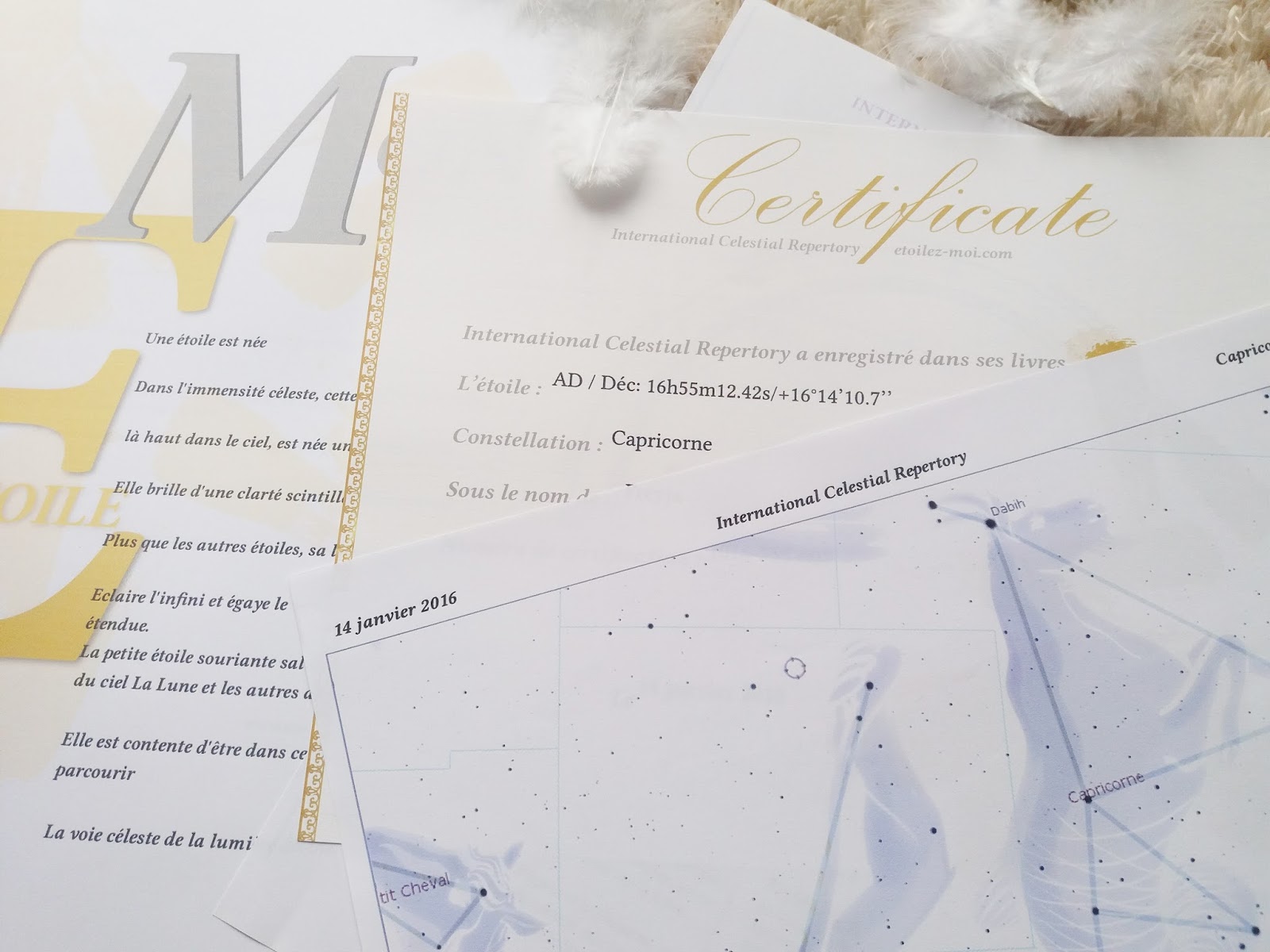 Nous avons reçu le coffret qui nous a permis de choisir le nom de notre étoile, la date du baptême et la constellation dans laquelle nous souhaitions voir notre étoile.Nous avons donc choisi de baptiser une étoile au prénom de notre fille et avons choisi sa date de naissance et son signe astrologique pour la date du baptême et la constellation.En quelques jours nous avons reçu notre coffret qui contenait un joli poème personnalisé, la fiche de la constellation du capricorne, la carte de ciel avec la localisation de notre étoile, la brochure du baptême d'étoile par l'International Celestial Repertory et le certificat d'enregistrement de l'étoile baptisée par l'ICR.