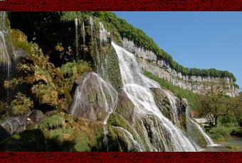 Située au fond de la reculée de Baume-les-Messieurs, cette cascade est remarquable. Elle est alimentée par le Dard, rivière souterraine au parcours tumultueux. L'eau jaillit au milieu d'une nature verdoyante et créé ainsi un mélange de couleurs somptueux.