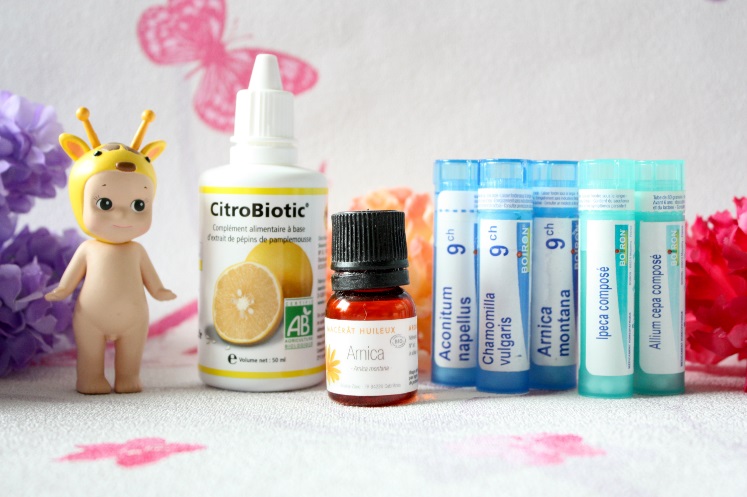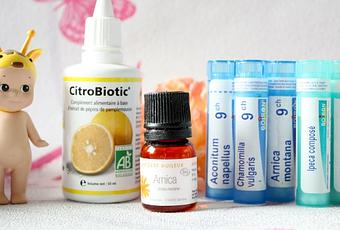 Depuis quelque temps je suis adepte de l'homéopathie, déjà pendant ma grossesse j'en avais pris pour m'aider lors de l'accouchement. Je vous en parlais dans cet article "comment je prépare mon corps à l'accouchement". Je crois que la première chose que j'ai acheté pour fille c'était Chamomilla vulgaris (9ch). Elle souffrait des dents et ce remède est le plus conseillé dans ce cas. Ceci dit, j'ai vu bien après un homéopathe qui m'a plutôt conseillé Belladona pour ma fille. Je ne peux donc que vous conseiller de voir un homéopathe pour savoir quel remède convient le mieux à votre enfant.En cas de fièvre j'utilise Aconitum Napellus (9ch) qui est un très bon remède dans ce cas. Il permet de la faire redescendre ou du moins éviter qu'elle augmente. Je l'avais acheté en prévention car je ne souhaitais pas donner de doliprane et je l'ai utilisé une fois où ma fille n'était pas en forme et était montée à 39. Le remède avait vraiment bien fonctionné!Pour les chocs ou les coups, un classique: Arnica montana (9ch). Un petit remède tellement utile quand bébé commence à se déplacer en rampant, à 4 pattes ou à l'acquisition de la marche. Je donne 3 granules dès qu'il y a un choc, cela va éviter ou limiter l'apparition du bleu et apaiser la douleur.