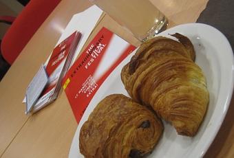 Je déjeune donc (un croissant, un pain au chocolat, et le meilleur jus de pommes que j’ai jamais bu – tchu j’ai oublié de demander la marque) et je fais connaissance de Gipsy, le chien guide le plus célèbre de Namur, il a participé à des tournages sur Canal C et va dans les écoles informer les enfants de sa fonction, avec bien sûr son couple de maîtres avec qui je fais connaissance, des gens supers.