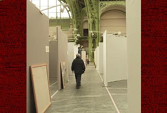 Les long des allées moquettées de plastique , les parois de contreplaquées recouvertes de tissus pelucheux se dressent , petites sentinelles distribuées sous les verrières de fer du Grand Palais.