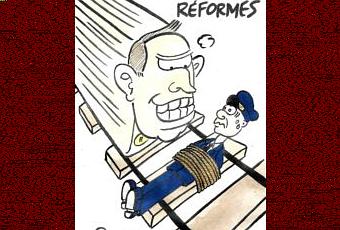 Le cheminot : J’te l’fais pas dire! Bon, j’m’excuse, c’est pas que j’m’ennuie, mais les collègues m’attendent pour la manif ! Allez, fais bon voyage !