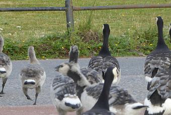 Sur les rives de la Baltique, la bernache est la reine en été. Par troupeaux entiers, ces oies-là sont à l’aise partout dans la capitale finlandaise, aussi bien sur les plages que dans les parcs. Et pour aller d’un point à un autre, il faut bien souvent traverser la rue. On place les juvéniles en première ligne, et c’est parti :