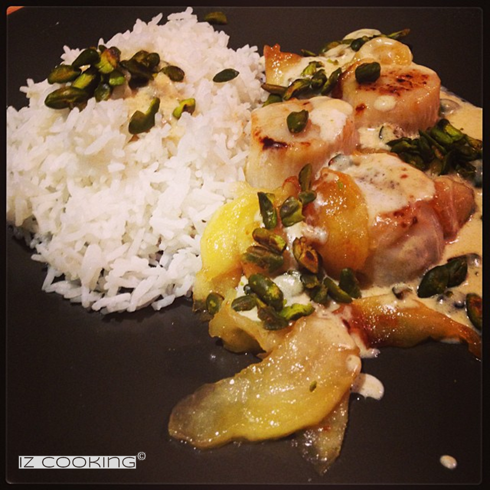 pistaches préalablement grillées à sec dans une poêle anti-adhésive 2 pommes type Golden ou Reinette 10 cl ce crème liquide 2 cuillères à soupe de sucre Un peu d'eau Sel et poivreServir avec du riz basmati