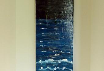 Cet été, c’est une tentative de peinture sur toile. Toile achetée il y a au moins 4 ans et qui traîne dans telle ou telle pièce, blanche comme neige depuis tout ce temps, attendant l’inspiration des Dieux qui, force est de constater, n’est pas venu avant cet été. Inspiration forcée par le fait de ne plus pouvoir voir cette carcasse traîner au sol quand elle devrait être sur un mur : celui de ma descente d’escalier !