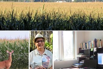 Encore l’été. Le matin, le jaune du champ de maïs. Souvent la brume venue de la rivière Petite-Rouge. Les montagnes bleutées. Le soir, le soleil couchant, de plus en plus au sud-ouest. Rond, orangé vif. Cette semaine, un chevreuil qui me regarde, qui se demande, qui attend et qui finit par partir vers la réserve Kenauk.