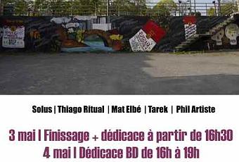Finissage et dédicace BD à l’Impermanence galerie le 3 mai à partir de 16h30. Le lendemain, le 4 mai, dédicace BD de 16h à 19h pour bien terminer cette exposition qui a connu un grand succès. Vous pourrez découvrir le MUR de la galerie réalisé par Thiago Ritual, Tarek, Tom Nelson (invité surprise) et les pochoirs de Mat Elbé. Vincent Pompetti sera présent en compagnie de Tarek pour les deux jours de dédicaces à la galerie.