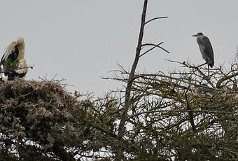 Veux-tu, s’il te plait, ami blogonaute, te téléporter vers la note du 2 juin : oui, voilà, c’est là. Tu te souviens donc, toi qui lis ce blog avec une assiduité sans faille, tu te souviens, disais-je, de cet arbre abritant à la fois un nid de cigognes et un nids de hérons cendrés, quelque part au beau milieu de l’île d’Oléron. Le double nid est toujours là, avec les cigognes à gauche et les hérons cendrés en droite :