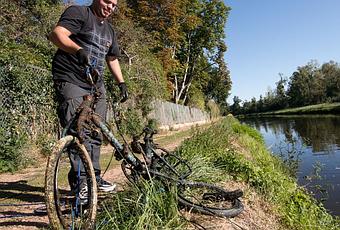 Un premier contact. Et ça promet d’être gros. "Ça a l'air gros", confirme Samuel en tirant sa corde avec précaution. Et le voilà qui repart sur le bord le vélo d'un adolescent qui était là depuis un moment. Les rayons ont disparu, la structure est complètement rouillée et envahie par les sédiments.
