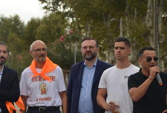 Romain Grau, député et Jean-Louis Chambon, maire de Canohès, présents aux côtés du président de l'association, M. Kadi (microphone).