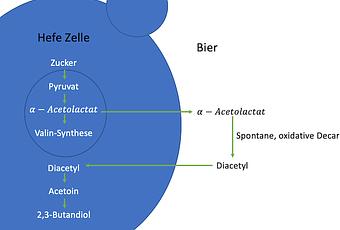 Ici, nous voulons aussi simplifier un peu. Le diacétyle est un produit du métabolisme des acides aminés (biosynthèse de l'isoleucine-valine) de la levure et se forme pendant la fermentation. Si la levure ne dispose plus de suffisamment de valine, elle peut la synthétiser elle-même. Cela produit de l'α-acétolactate. Cela donne la levure dans le moût employé. L'α-acétolactate est ensuite converti en diacétyle de manière non enzymatique via une décarboxylation oxydative spontanée.