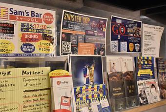 Un mur à lui: des tracts faisant la promotion de divers événements communautaires jalonnent les murs du Sam’s Bar TalkEigo à Fukuoka. Le propriétaire du sultan Sam Sam Vidhani a déclaré que le plus difficile de la création de son entreprise était de trouver un propriétaire qui louerait à une personne non japonaise. | IRINA GRIGOROVICI