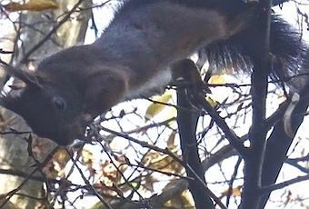 C’était un jeu du temps marmot, du temps du trapèze sur le portique du jardin : coincer la barre sous les genoux, tête en bas. On appelait ça « le cochon pendu ». C’est précisément à cette figure de style enfantine que j’ai pensé en voyant un écureuil, autrement plus agile que moi en mode minot, qui, pour choper le fruit qu’il convoitait, se contorsionnait en tous sens sur des brindilles frêles, risquant à chaque instant la dégringolade au pied de l’arbre, se rattrapent de justesse et grignotant avec bonheur la noix tant désirée