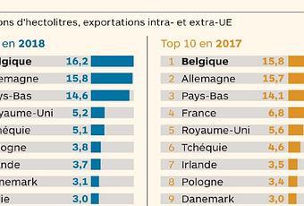 Pour la deuxième année consécutive, la Belgique occupe la première place en Europe dans le classement des exportations de bière. En 2018, elle a renforcé son avance sur l'Allemagne, l'ancienne numéro un.
