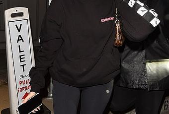 La chanteuse, âgée de 20 ans, a coupé une silhouette décontractée pour sa soirée avec son mec, portant un pull à col en v noir avec une paire de leggings assortis.