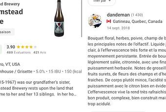 Capture d’écran de l’application officielle RateBeer. La page principale de Florence de Hill Farmstead Brewery et une revue française de l’utilisateur dandeman.