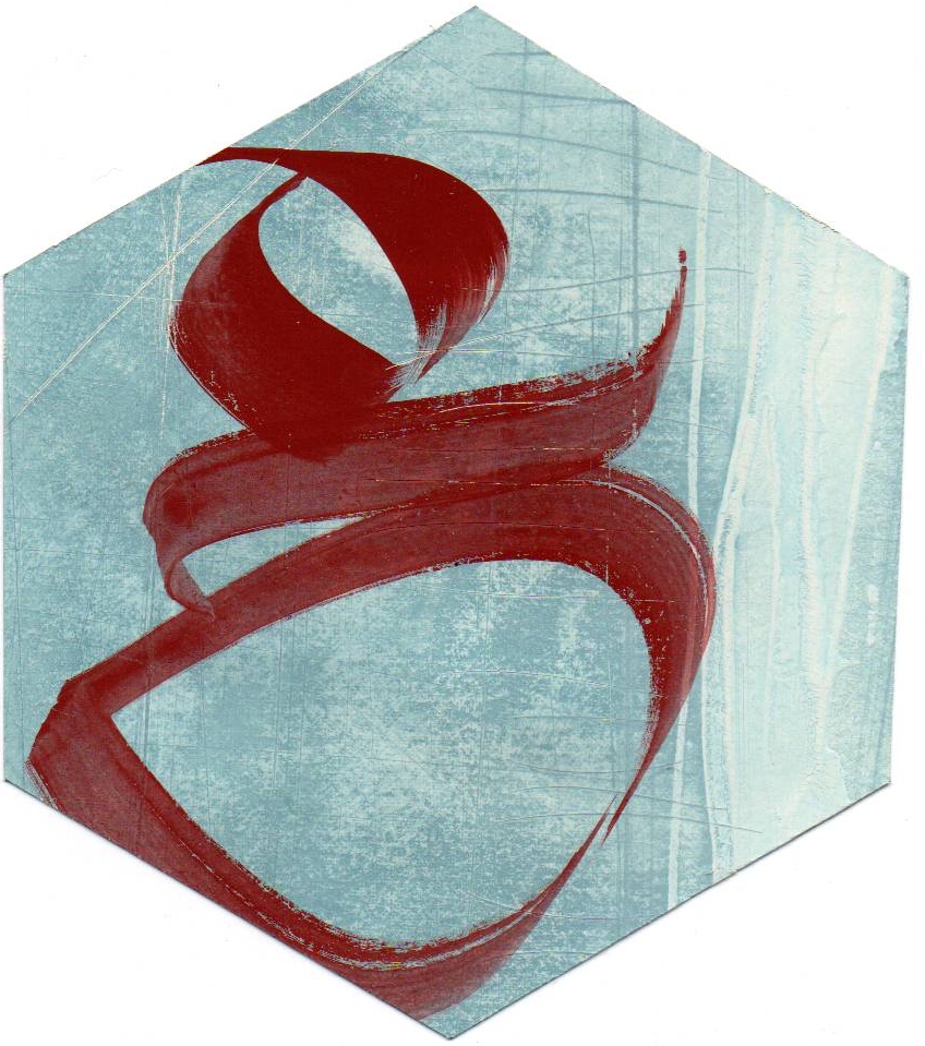 J'ai bien sûr travaillé sur papier enduit. Pour commencer, je me suis amusée à quelques recherches de "g" au pinceau plat sur un bout de journal. Lorsque j'ai été au point (…), j'ai tracé sur mon hexagone. En noir et en rouge de venise (Gouaches Sennelier). Puis j'ai publié sur Instagram. Pour en savoir plus, allez faire un petit tour ici :