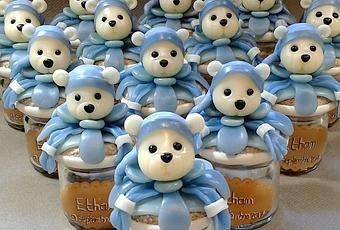 15 pots à dragée avec doudou, 2 pots assorti Parrain/Marraine et d'une figurine pour gâteau avec inscription relief