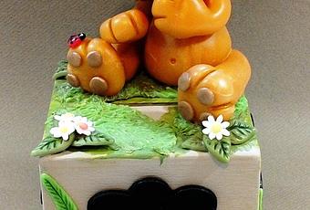 Tirelire en bois avec décor en porcelaine froide