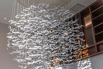 16 au 20 novembre 2019Nous avons réalisé et installé (Robert et moi) une immense sphère au plafond de la nouvelle résidence France Senior à Saint-Quentin. Voici les photos de l’œuvre, prise sur place, pendant l’installation. Le diamètre de la sculpture est de 260cm pour une hauteur totale de 350cm , les éléments sont en polymère peint en blanc pour donner l’apparence de la porcelaine. Vu la fragilité, le poids et la distance du transport, ce choix de matériaux s’avère approprié. Les dessins du salon-bar-accueil ont été réalisés, par “Flamant id.” Architecte-designer et concepteur de l’aménagement de la résidence France Sénior. Un très grand merci à Thierry pour son aide et son professionnalisme.