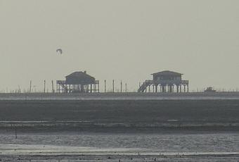 Alors on prend le volant de la vieille Renault, qui franchit aujourd’hui même ses 156 000 km et un double ralentisseur sans broncher, et on se pose au fond du Bassin d’Arcachon, ciel gris, marée basse, sable doux aux pieds, air frais qui sent bon. La vue est dégagée, on distingue sans mal les cabanes tchanquées de l’île aux oiseaux :