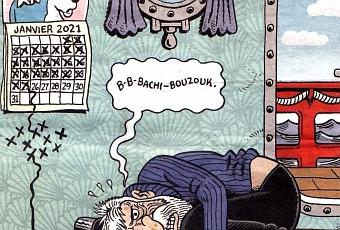 "Libération" (29 janvier) n'a pas dérogé à la tradition qui consiste à faire illustrer un numéro entier par des auteurs de BD. L'Américain Derf Backderf (ci-dessus) ironise gentiment sur le thème du Capitaine Haddock, prostré à cause du confinement qui le prive de sa drogue préférée et de son compagnon d'aventure, emporté par le coronavirus malin.