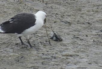 La manière de préparer puis déguster la seiche ou l’encornet est parfaitement maîtrisée par le goéland adulte. Sûr de son geste et sur l’estran, il tire vers lui l’animal dont il compte bien faire son repas, en utilisant pour cela un long tentacule de la bête :