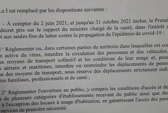 Le document, dont la première page est reproduite ci-dessus précise en effet: " À compter du 2 juin 2021 et jusqu'au 31 octobre 2021 inclus, le Premier ministre peut, par décret pris sur le rapport du ministre chargé de la santé " procéder comme il l'entend à de nouvelles restrictions de circulation ou de réunion et à des fermetures d'établissements, là où " est constatée une circulation active du viru s ".