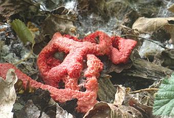 Très récemment, j’ai pu observer deux de ces champignons. Tout d’abord le clathre rouge, ici avachi et n’ayant plus la forme de lanterne qui lui est propre :