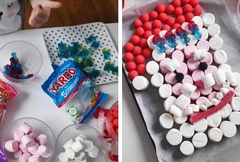 On a ensuite fait le visage en chamallows roses et la barbe en blancs. Pour la déco du chapeau, on a mis des schtroumps rouges et bleus.
