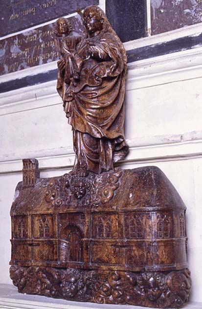 Ville d’Italie (Marches), basilique de pèlerinage de la Santa Casa des XVe-XVIe siècles. « … dans les premières années du XVIe siècle, on commença à parler chez nous d’une ville lointaine où la Vierge manifestait sa puissance plus qu’en aucun lieu du monde : c’était Lorette, dans la Marche d’Ancône. Peut-être les soldats de nos guerres d’Italie rapportèrent-ils en France, les premiers, le petit livre du pèlerin de Lorette, dont on peut voir un exemplaire à la Bibliothèque Nationale. Toujours est-il qu’en 1518 les Français s’acheminaient déjà vers le sanctuaire italien. Le petit livre racontait au voyageur une étrange merveille. On lui disait que le 12 mai 1291, au moment même où les Sarrasins venaient de chasser les derniers Francs de la Terre Sainte, les anges avaient paru à Nazareth, et avaient emporté du côté de l’Occident la maison de la Vierge, sainte maison où le Verbe avait été conçu. Ils la déposèrent d’abord en Dalmatie, puis en Italie, au milieu d’une forêt, à l’endroit qui plus tard s’appela Lorette… Il semble bien prouvé aujourd’hui que cette légende, destinée à tant de célébrité, est née seulement en 1472, car on n’en trouve aucune trace avant cette date. Elle paraît avoir été imaginée par Pierre di Giogio Tolomei, prévôt de Teramo. Il cherchait évidemment à s’expliquer pourquoi, quand, au XVe siècle, on avait refait l’église de Lorette, on avait conservé avec tant de respect, au beau milieu du sanctuaire, une vieille petite chapelle de la Vierge où on venait en pèlerinage depuis des siècles. » (E. Mâle, L'art religieux de la fin du Moyen Age en France, A. Colin, Paris, réédition de 1995, in 4°, p. 202-204)