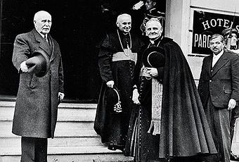 Philippe Pétain et, à sa gauche, les cardinaux français Emmanuel Suhard et Pierre Gerlier, ainsi que Pierre Laval, en novembre 1942
