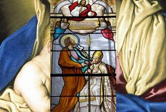 Illustration: vitrail de l'église des Estables, diocèse du Puy (crédit photo Anne); Pie XII est placé sous la protection et l'intercession de Saint Joseph auprès du Seigneur. La phrase 'tu es Pierre et sur cette pierre je bâtirai mon Église' rappelle, en même temps que la présence de saint Joseph (Patron de l'Église universelle), la protection du Ciel envers l'Église.