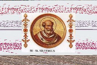 Dans l'île de Palmaria au large de Gaëte dans le Latium, le trépas de saint Silvère, pape et martyr. N'ayant pas voulu rétablir Anthime, évêque hérétique de Constantinople, que saint Agapit, son prédécesseur, avait déposé, il fut, à l'instigation de l'impératrice Théodora, chassé de son siège et envoyé en exil, d'abord en Asie, puis dans cette île, où il mourut, écrasé par les peines endurées.