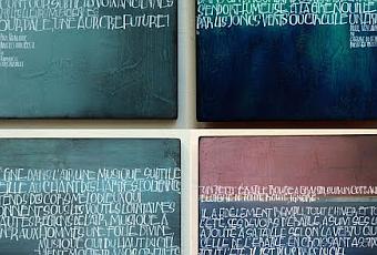 Ils sont calligraphiés à la plume pointue sur des enductions colorées et animées par des voiles pigmentés noir et blanc et conjuguent rythmes graphiques et lisibilité.