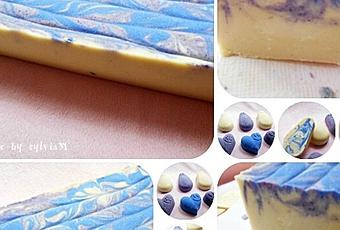 Une semaine apres mon prmeier savon l'envie de recommencer a été la plus forte, voici donc un nouveau savon aux couleurs tres estivales (et en ce moment on en a bien besoin), a base d'olive, beurre de coco et cacao, d'argan, et avocat, poudre d'argile blanche et fragrance frangipannier ! Colorants bleu et mauve pour le marbrage et aussi des paillettes pour le faire briller !