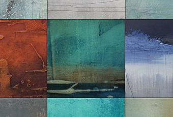 Vous pouvez voir sur l'image une sélection de matières obtenues sur medium enduit : travail des pigments, des encres, de la poudre de marbre en enduit ou en lait, des applications de papier asiatique.