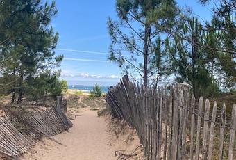 Une image classique : le chemin sableux bien bien mou qui tire sur les pattes, dans la forêt, et au bout c’est la mer. On distingue le bleu de l’océan, les barrières qui protègent la dune. Un vrai paysage de vacances.
